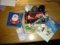I received chocolate, squishy mice, a mouse pen, three candy canes and three Christmas cards… (well actually I got one of the candy canes and two of the cards earlier, but I’m putting one picture with all of them here…