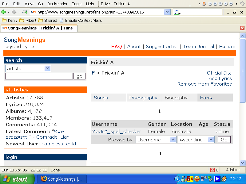 Welcome to the next edition of getting to know your friends. Okay, here’s what you’re supposed to do, and try not to be lame and spoil the fun….Copy (Not reply to) this entire bulletin and paste it onto a new bulletin that you can post. Change all of the answers so that they apply to you. Then, post this so a whole bunch of people you know can see. The theory is that you will learn a lot of little-known facts about your friends. It is easy and fun.